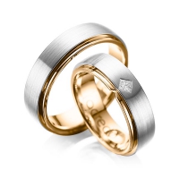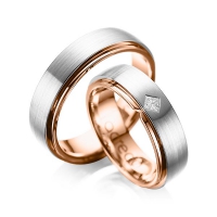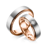 Paar Trauringe/Eheringe von acredo in aussen Platin 950/- , innen Rotgold 750/- Oberfläche: längsmatt, poliert mit zus. 0,1 ct. Prinzess-Diamant tw, si (Produkt 1 mit Steinbesatz, Produkt 2 ohne Steinbesatz)