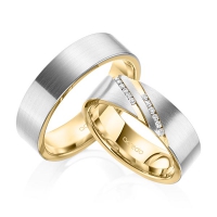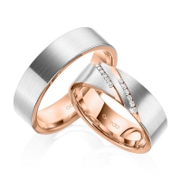 Paar Trauringe/Eheringe von acredo in aussen Weissgold 585/- , innen Rotgold 585/- Oberfläche: längsmatt, poliert mit zus. 0,12 ct. Brillant tw, si (Produkt 1 mit Steinbesatz, Produkt 2 ohne Steinbesatz)