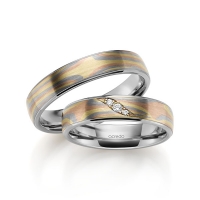 Paar Trauringe/Eheringe von acredo in Mokume Gane Grüngold 750/-, Rotgold 585/-, Graugold 585/- Basis-Ring Weissgold 585/- Oberfläche: längsmatt mit zus. 0,035 ct. Brillant tw, vs (Produkt 1 mit Steinbesatz, Produkt 2 ohne Steinbesatz)