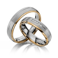 Paar Trauringe/Eheringe von Steinberg in Rotgold 585/- Weissgold 585/- Oberfläche: poliert, längsmatt mit zus. 0,05 ct. Brillant tw, si (Produkt 1 mit Steinbesatz, Produkt 2 ohne Steinbesatz)