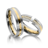 Paar Trauringe/Eheringe von Steinberg in Weissgold 585/- Gelbgold 585/- Oberfläche: längsmatt, poliert mit zus. 0,16 ct. Brillant tw, si (Produkt 1 mit Steinbesatz, Produkt 2 ohne Steinbesatz)