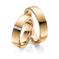 Paar Trauringe/Eheringe von acredo in aussen Gelbgold 585/- , innen Gelbgold 585/- Oberfläche: poliert mit zus. 0,09 ct. Prinzess-Diamant tw, si (Produkt 1 mit Steinbesatz, Produkt 2 ohne Steinbesatz)