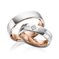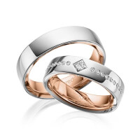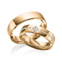 Paar Trauringe/Eheringe von acredo in aussen Rotgold 585/- , innen Rotgold 585/- Oberfläche: poliert mit zus. 0,326 ct. Prinzess-Diamant & Brillant tw, si (Produkt 1 mit Steinbesatz, Produkt 2 ohne Steinbesatz)
